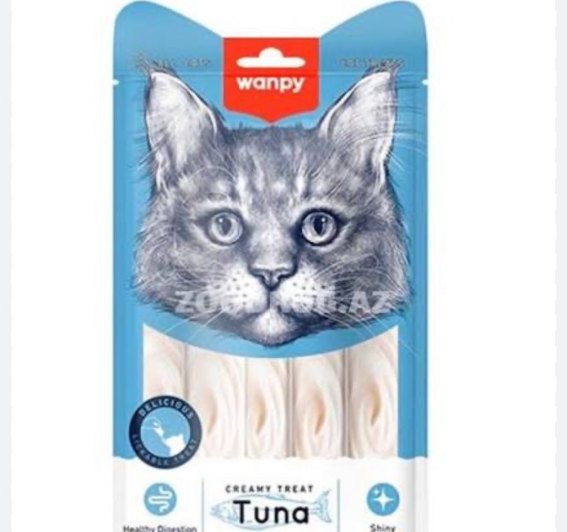 Wanpy Pişik üçün krem çərəz, tuna balığı ilə. Ən kaprizli pişiyi belə sevindirən ləzzət! Dadlı çərəzi yem qabına sıxmaq, çərəz üçün oyuncaqda vermək və ya dərhal əlinizdən yedizdirmək olar. Tərkibində rəngləndirici və dadvericilər yoxdur. Yaxşı həzm olunur və tükü parlaq edir. Bir qablaşdırmaya hər biri 14 qram olmaqla 5 ədəd krem şəklində çərəz daxildir.
