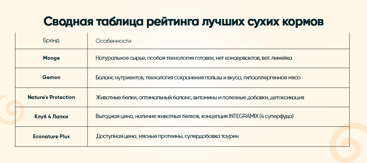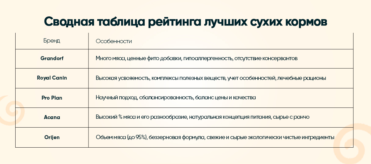 Для вашего удобство мы подытожим особенности каждого бренда сухого корма из нашего импровизированного рейтинга в виде таблицы.