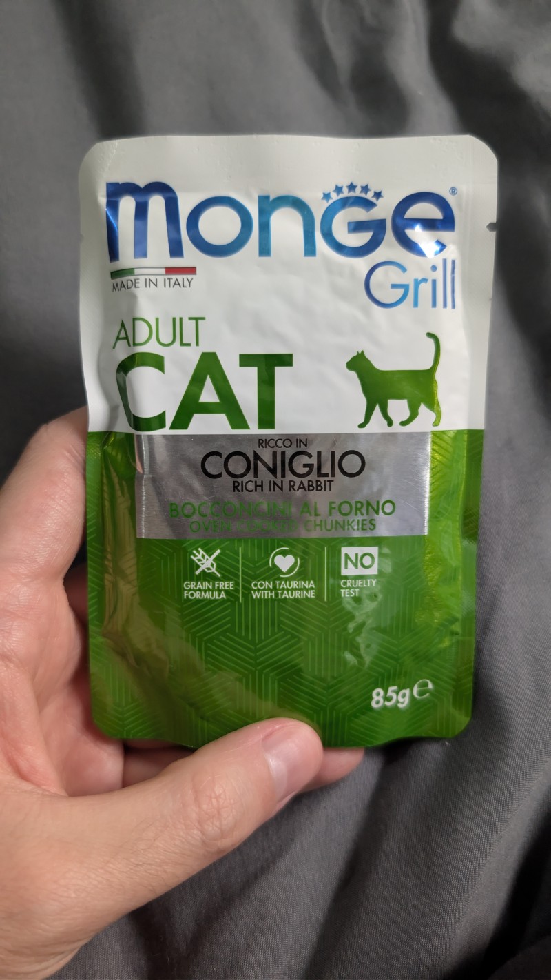 Основой рациона Monge Grill являются кусочки итальянского кролика, приготовленного на гриле с добавлением овощей, выращенных в экологически чистых районах Италии, а также витаминов и минералов. Кролик является источником легкоусвояемых белков.